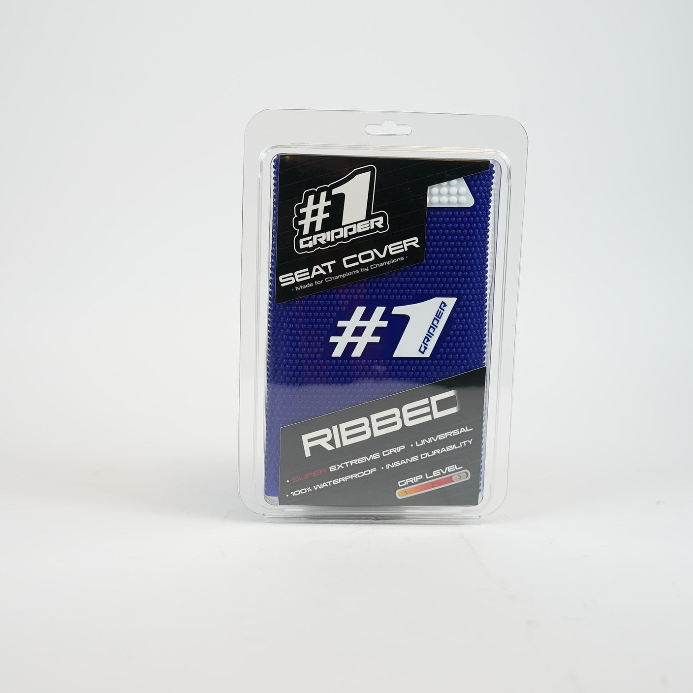 Premium sadelöverdrag från OneGripper ribbad design i blå/vit för extremt grepp och hög hållbarhet under motocross-, enduro- och offroadkörning.