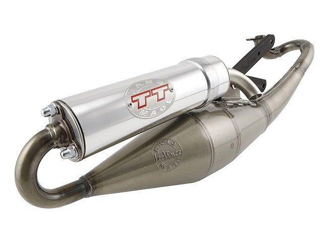 Full-system avgassystem med expansionskammare och aluminiumljuddämpare - handgjord TIGsvetsad konstruktion med stålrör och transparent lack. Homologerat (Egodkännande) för Piaggioscootrar, levereras komplett med fästen och insats för Variomatiks justering.
