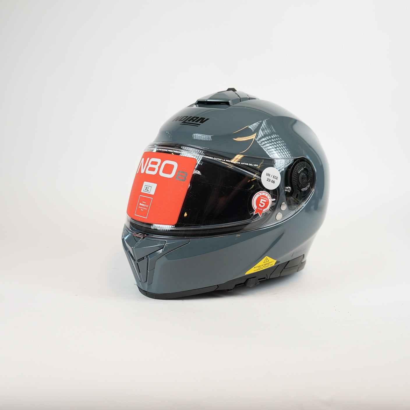 Nolan N808 är en full-face hjälm med skal i högstyrkig polykarbonat (Lexan), certifierad enligt ECE22.06 och DOT, vilket innebär modern, strikt säkerhetsstandard.