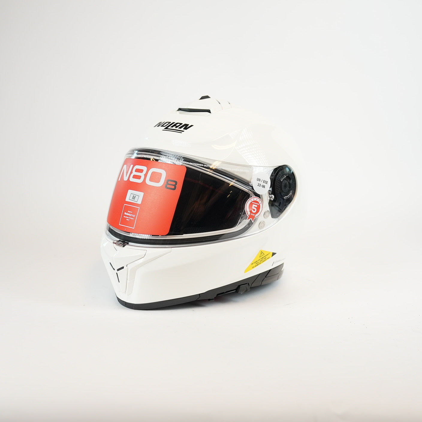 Nolan N808 är en full-face hjälm med skal i högstyrkig polykarbonat (Lexan), certifierad enligt ECE22.06 och DOT, vilket innebär modern, strikt säkerhetsstandard.