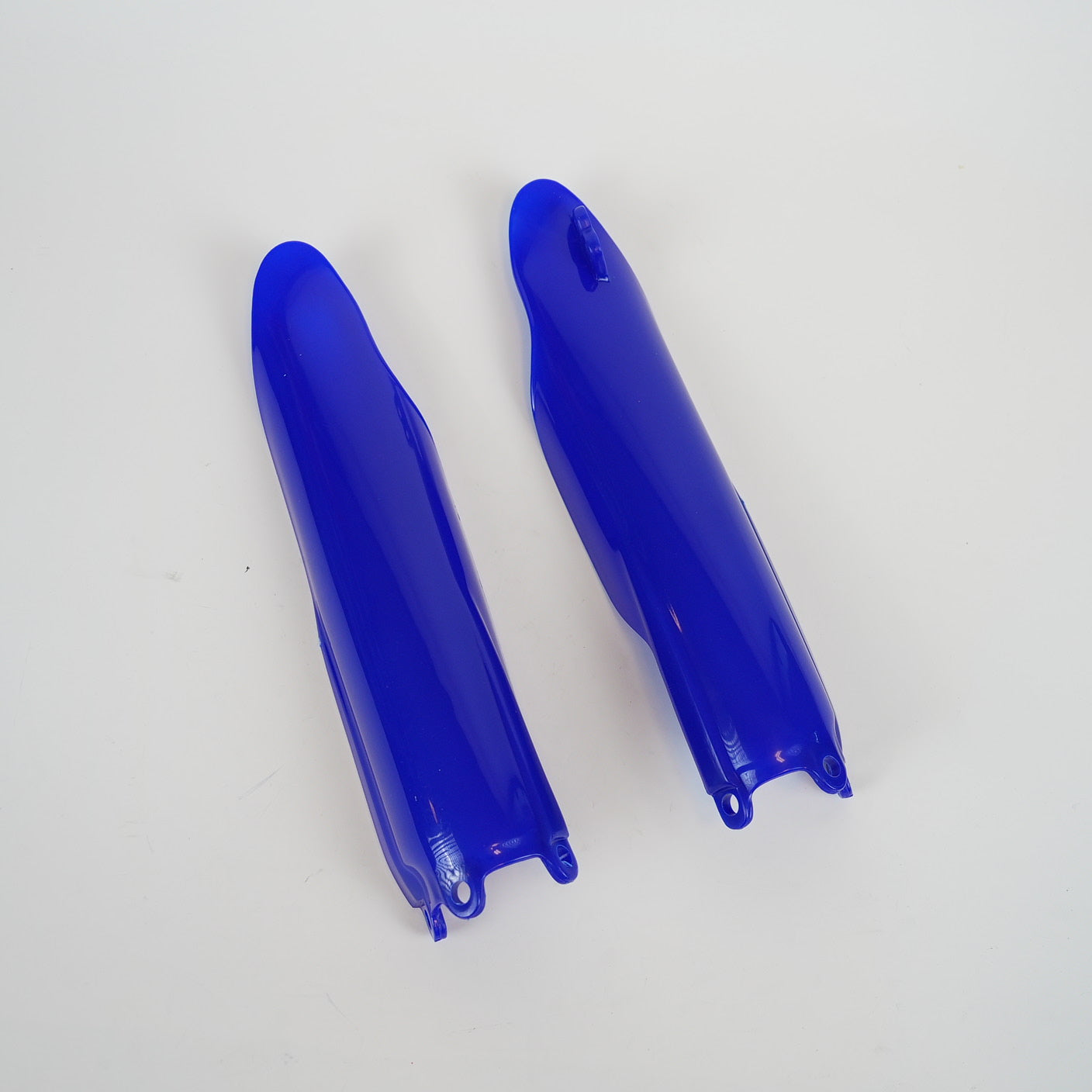 Injectionmolded fork slider protectors i OEM-reflexblå plast - skyddar gaffelbenen mot stenflis och slitage, med förbortrade fästhål och perfekt passform.